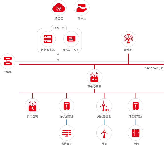 太阳成集团tyc33455cc风光储一体化解决方案是融合物联网技术,将风能、太阳能、储能以及EMS能源管理系统结合起来,实现风、光、储多能互补协同运行,能源精准调配减少弃风弃光,提高能源综合效率,同时通过调峰、调频和调相等功能,有效抑制电网波动,提升电网稳定性、可靠性。