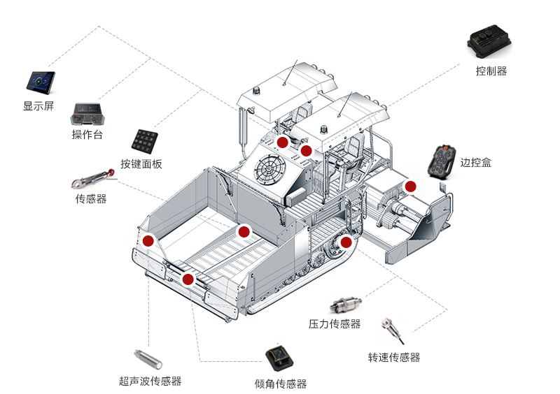 太阳成集团tyc33455cc摊铺机解决方案整合了感知技术、自动控制系统和数据分析算法,实现了摊铺机高度智能化操作。通过实时获取路面信息和实时调整施工参数,使摊铺机操作更加精准、高效和可靠。